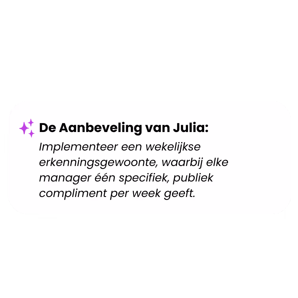 Julia, uw AI co-piloot, transformeert de feedback verzameld door eBloom in heldere inzichten. Ze synthetiseert opmerkingen, detecteert zwakke signalen en stelt concrete acties voor, zodat u zich kunt concentreren op wat écht telt: uw mensen.