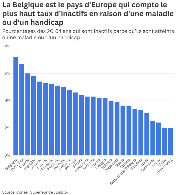 Om de ernst van de nieuwe maatregelen te begrijpen, moeten we de realiteit onder ogen zien: het Belgische socialezekerheidsstelsel staat op instorten.Lange tijd was werkloosheid de nationale prioriteit nr. 1. Vandaag is de curve omgebogen. België telt inmiddels aanzienlijk meer langdurig zieken (meer dan een jaar afwezigheid) dan werkzoekenden. De vaststelling is onverbiddelijk: België is momenteel het land in Europa met het hoogste percentage inactieven als gevolg van ziekte of handicap. De officiële cijfers van het RIZIV, de RTBF en de recentste analyses van SD Worx (januari 2026) schetsen een alarmerend beeld: